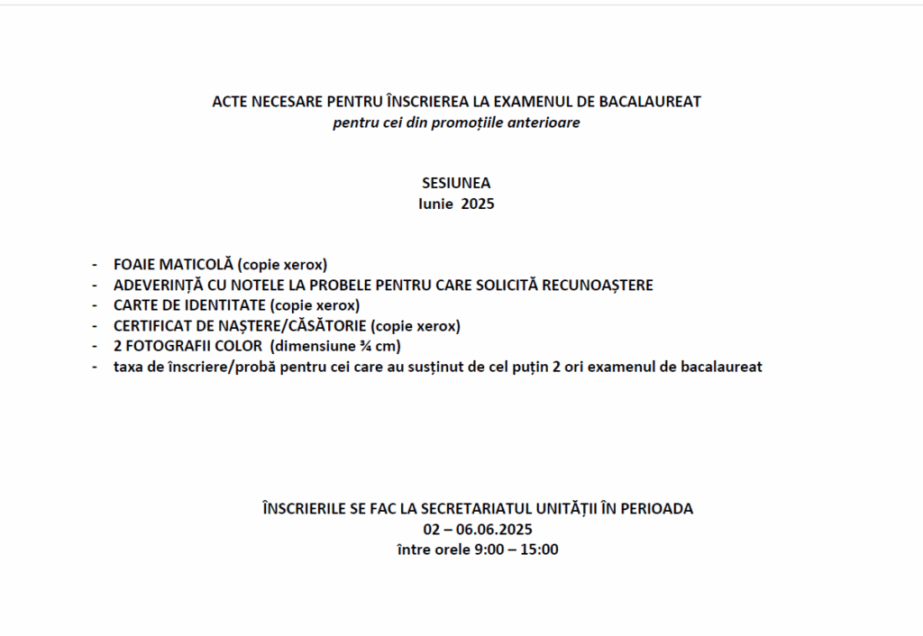 PROGRAM ÎNSCRIERE CANDIDAȚI LA EXAMENUL NAȚIONAL DE BACALAUREAT SESIUNEA AUGUST 2025 ESTE ÎN PERIOADA 14-21 IULIE LA SECRETARIATUL UNITĂȚII ÎNTRE ORELE 9,00-15,00.